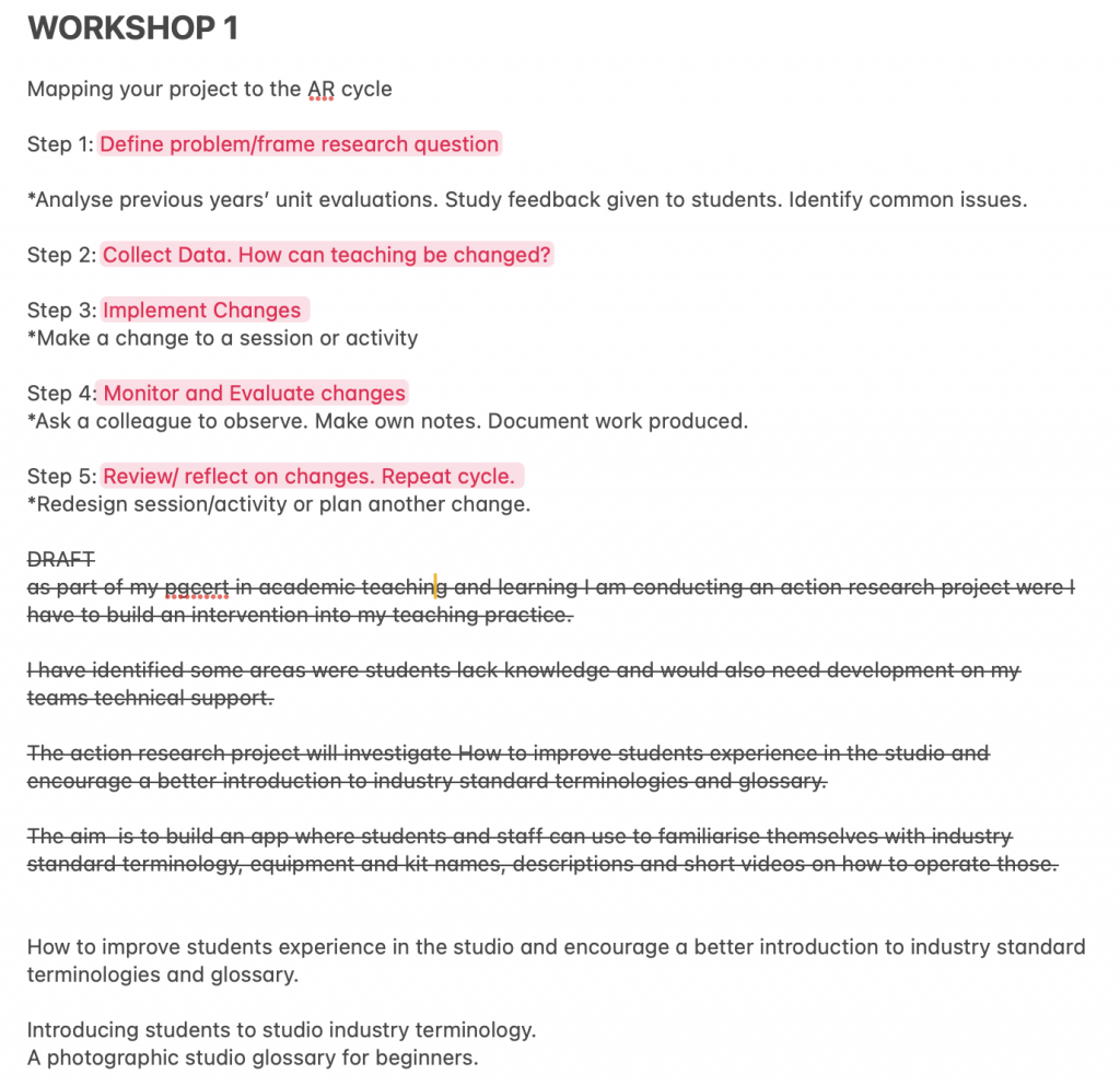 My aim is to design and implement an intervention that moves from reactive accommodation to proactive inclusive design. Grounded in intersectional social justice (Crenshaw, 1991; Bell, 2007) and inclusive pedagogies (Hockings, 2010), this toolkit seeks to create more equitable and accessible learning environments. The intervention is shaped by both lived experience and observation in technical workshops, and supported by critical reflection and peer feedback throughout the Inclusive Practices (IP) unit.